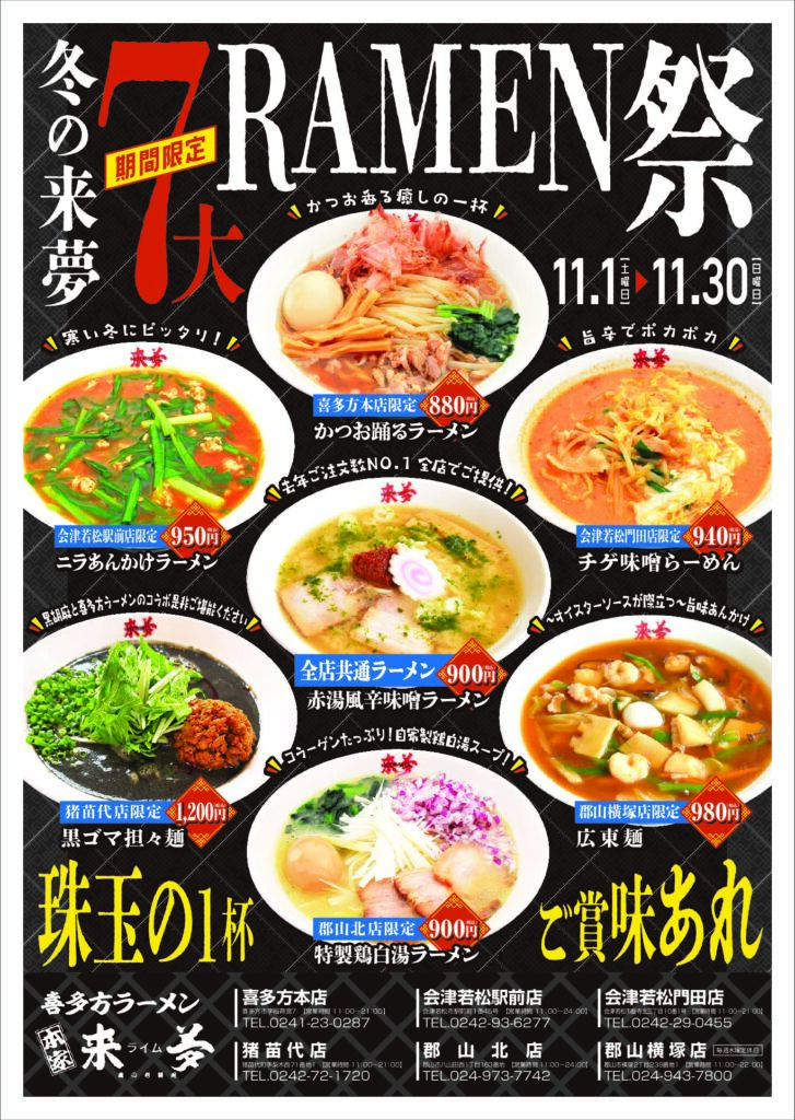 お知らせ News お知らせ 2025.10.16 11月1日~11月30日までの期間限定 新作ラーメン! 11月1日~11月30日の期間限定で 喜多方ラーメン来夢全店舗 新作ラーメン販売開始! 各店の個性あふれる 各店限定新作ラーメン をお楽しみ下さい。 また、去年のご注文数NO.1 赤湯風辛味噌ラーメン は全店舗で販売されます。 是非この機会に 去年のNO.1商品 や 各店限定の個性あふれる新作ラーメンをご堪能下さい。 喜多方ラーメン来夢 従業員一同 お客様のご来店を心よりお待ち申し上げております。